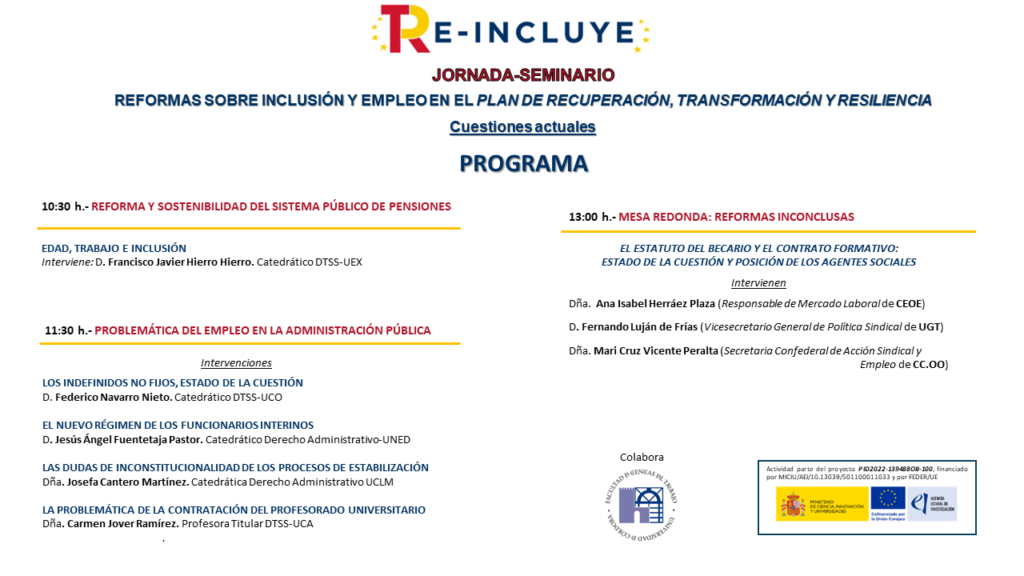 El 21 de junio de 2024 se celebró en la Universidad de Córdoba el Seminario-Jornada «Reformas sobre inclusión y empleo en el Plan de Recuperación, Transformación y Resiliencia (PRTR). Cuestiones actuales».